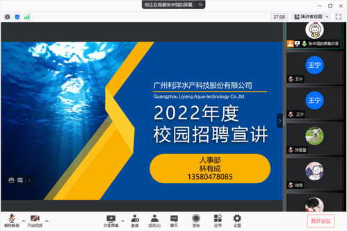 10月11日下午,广州利洋水产科技股份有限公司“热爱水产,把握未来”硕博专场招聘会在bevictor伟德官网会议室成功举办。公司党总支副书记衣启麟、利洋人事部经理林有成、公司部分2022届毕业研究生参会。此次招聘宣讲会为本年度公司首个硕博专场招聘会,公司在前期通过微信公众号等多种渠道进行专场招聘宣传,同时安排专人与企业进行洽谈对接,做好了充分的会议筹备工作。