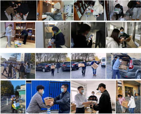 活动中,校内管理区丁君副经理(主持工作)、沈文静老师带领的研究生、本科生志愿者团队将公司2018级57名员工滞留在校内图书馆、獐子岛教学楼、养殖楼内的复习资料、笔记本电脑等个人物品总计800余件物品通过电话或视频进行联系一一对接、清点、整理、打包封存。邱金英书记带领的疫情防控志愿者教师团队的王伟老师、郝振林老师、马德友老师、薛壮老师、韩冰老师分批将物品安全运送至老员工公寓并进行消杀。老员工公寓管理区韩雨哲副经理、卢星宇老师带领公寓志愿者一一将物品发放至每名同学手中。