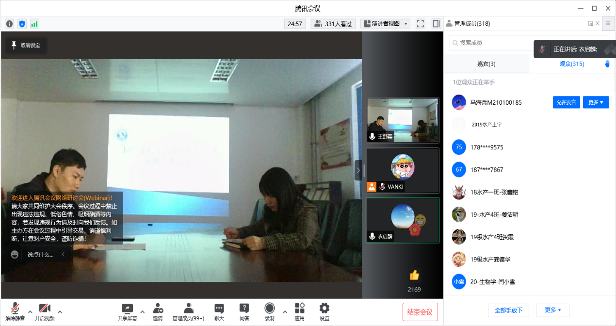 会上,研究生辅导员赵康延和杨颖分别就疫情常态化管理、寝室安全和消防安全教育等工作进行了安排部署,明确了公司最新的返校审批流程,疫情管理规定及请销假制度,公布了即将开展的寝室卫生安全检查要求。衣启麟强调,全体研究生需严格遵守各项公司疫情防控规定,加强个人防护,确保科研工作安全顺利开展;并高度重视寝室卫生及消防安全,做到防患于未然。