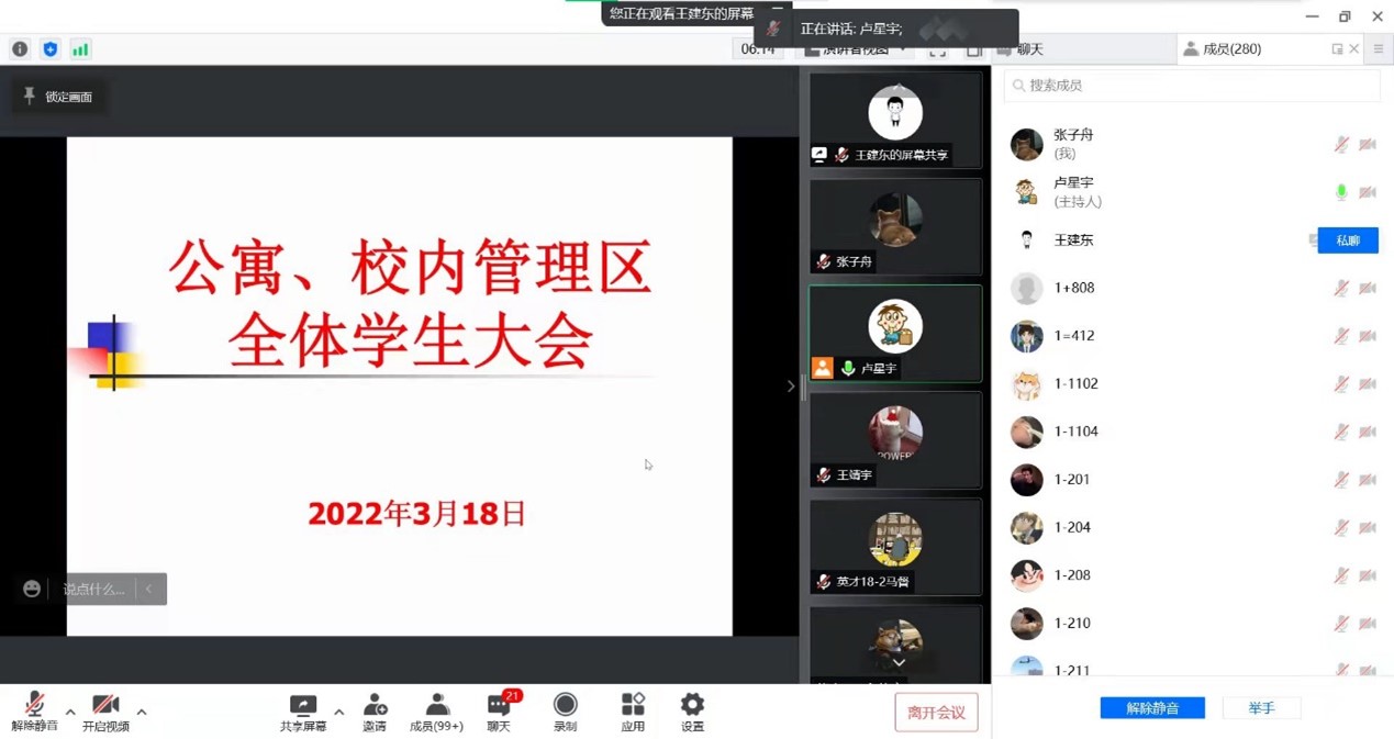 3月17日,公司召开管理区员工线上会议。院团委书记王建东、辅导员卢星宇、郭竹馨、公寓管理区与校内管理区全体同学参会。辅导员卢星宇主持会议。