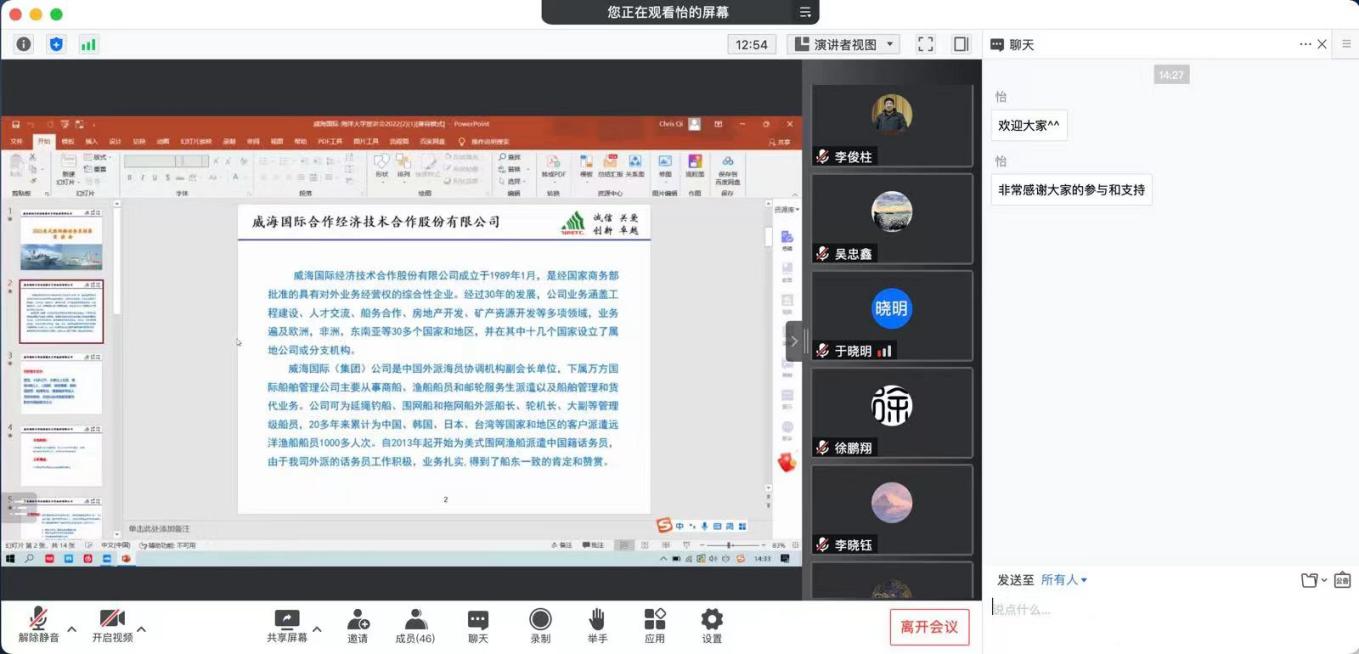 会议伊始,邢老师介绍了线上招聘会的流程以及会议过程中的注意事项。随后,威海国际(集团)公司以PPT形式进行了宣讲,从关于我们,招聘岗位,薪资待遇和职业发展等方面进行了较为全面的介绍。在答疑环节,威海国际(集团)公司渔业事业部总经理葛平刚对同学们比较关心的“五险一金”,出海时长,船上生活情况等问题一一耐心作答。