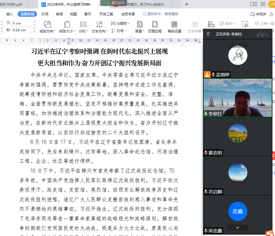 会上,李俊柱带领与会人员集体学习了习近平总书记在辽宁考察时重要讲话精神、习近平总书记在省部级主要领导干部专题研讨班上、在中央统战工作会议上的重要讲话精神等内容。在研讨交流环节,衣启麟志作了主旨发言,其他与会同志分别做了交流发言。
