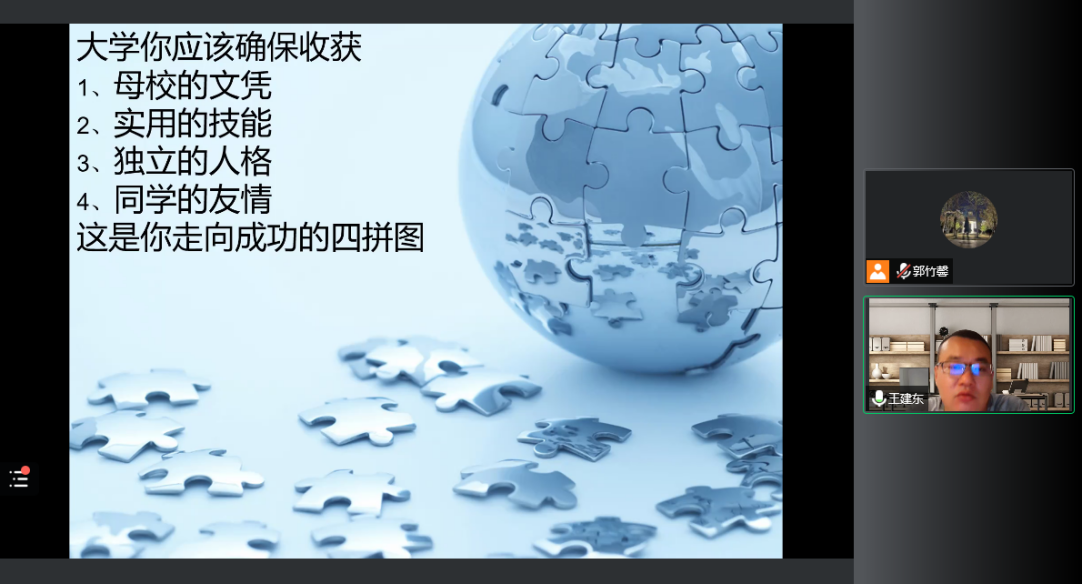 王建东以“如何读大学”为主题,针对新时代老员工特点,向同学们提出四点建议,一是要遵守校规校纪,早定目标,不负韶华;二是学有所获、学有所能;三是要有独立的人格,做不一样的自己,成为一个自省、自律、自强、自强的人才;四是要珍惜友情与师生情,学会理解和宽容。他希望同学们可以收获走向成功的四块拼图,在学习生活中实现青春价值。最后,他与同学们进行互动交流。