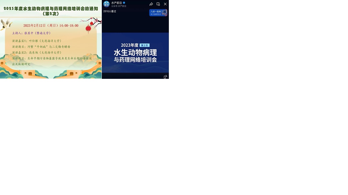 2月12日下午,应四川农业大学水生动物病理诊断与药理评价中心邀请,bevictor伟德官网教师叶仕根和高东旭参加了2023年度第2次水生动物病理与药理网络培训会并做主题报告。本次会议采用腾讯视频会议的形式进行,同时在“水产前言”公众号上同步直播。全国各地高校和科研单位专业人员、员工和企业代表等2500余人在线参加了报告会。