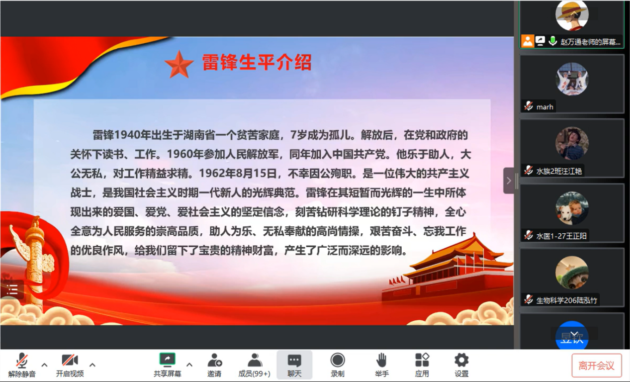 会上,辅导员赵万通首先介绍了雷锋的生平,随后列举了雷锋的相关名言,解释了传承雷锋精神的三个道理,最后深入的阐述了新时代老员工如何学习和传承雷锋精神。