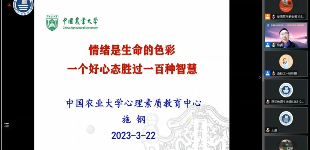3月22日,bevictor伟德官网小水滴心灵驿站开展线上“公益幸福课”,中国农业大学心理素质教育中心主任施钢主讲,2022级、2021级、2020级全体同学观看直播。