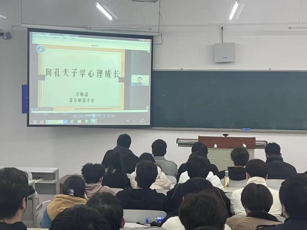 课上,宋振韶结合鲜活生动的案例围绕“向孔夫子学心理学成长”主题,展开介绍“什么是心理成长”、“为什么要心理成长”、“为什么要向孔夫子学心理成长”、“如何向孔夫子学心理成长”等内容。让同学们从孔夫子解决人与世界关系的态度方法中获得启发,处理好己与物、己与人、己与事、己与己等关系,推动心理成长,迎接幸福生活。