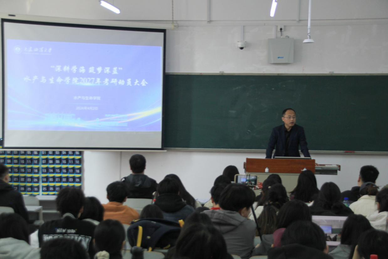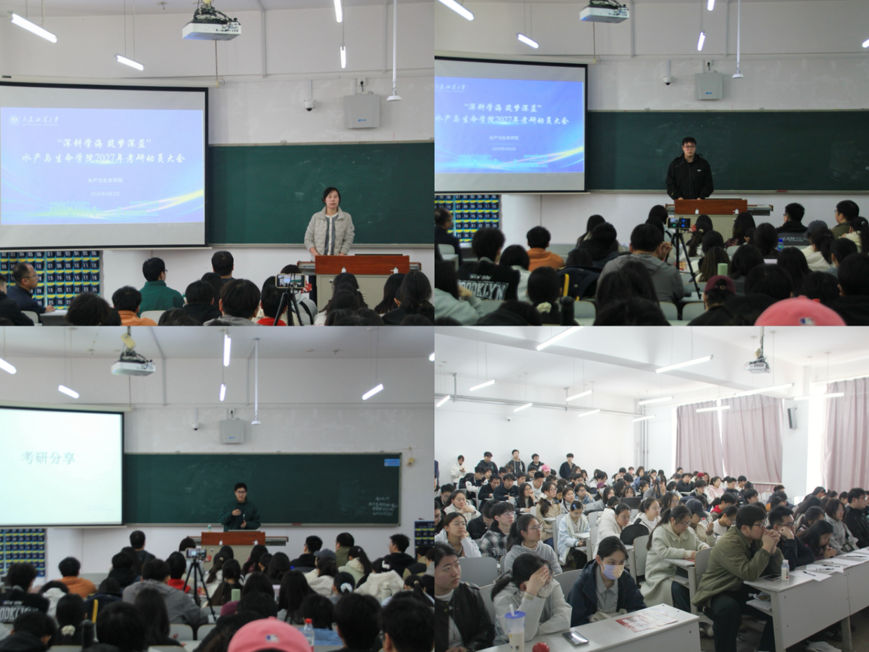 刘宪杰分析了近年考研形势与录取趋势,建议员工结合自身实力理性择校,尽早制定复习计划,并强调备考过程中坚持的重要性。王涛结合当前就业形势,鼓励员工立足专业、放眼未来,科学规划个人发展路径。会议指出,考研与就业并非对立选择,而是人生发展的不同路径,员工应根据自身实际理性抉择,早做准备、主动出击,在升学深造与职场实践中找准定位、实现价值。2022级水产养殖学专业占志伟、2022级水族科学与技术专业冯豫斌同学结合自身考研经历,围绕就业方向、学习安排与考研准备进行了细致分享,并针对同学们提出的跨考选择、考研数学准备等具体问题给予了务实建议。